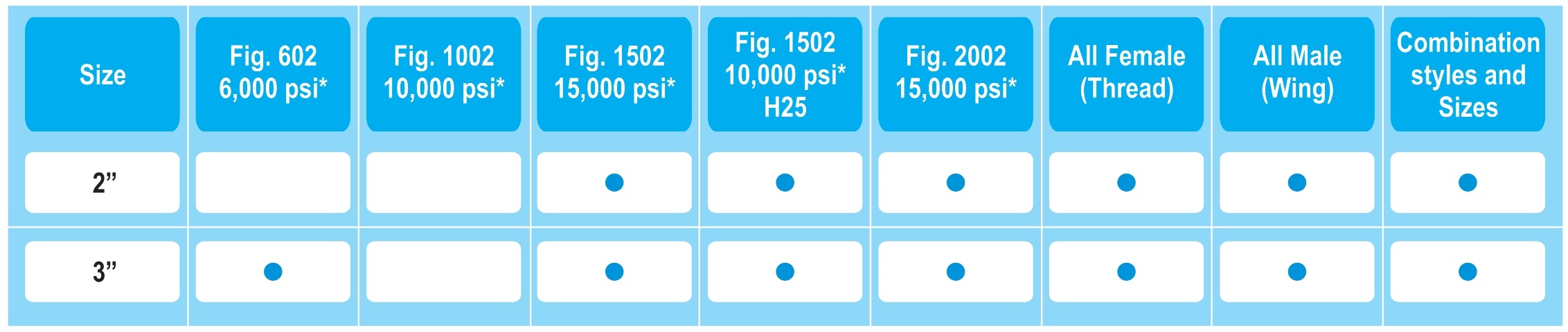 Available in a variety of sizes and thread types in female-to-male, female-to female, and male-to-male configurations from 1″ thru 4″, in pressure rating from 6,000 to 15,000 psi NSCWP✶ in standard service, and up to 10,000 psi in sour gas service.